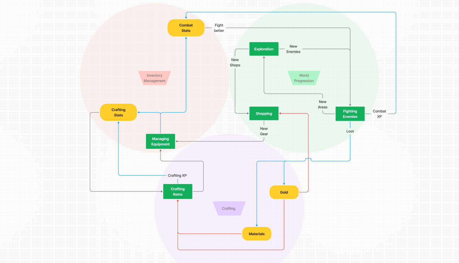 Now we know what to build, but we still need to figure out how it all connects, so we shift perspective a bit to look at the game loop. At this point we’re looking at things from the perspective of the player’s in-game actions, and how they move us through the game:
